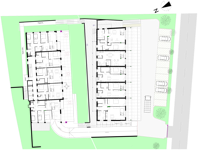 Es gliedert sich in zwei Baukörper mit einer gemeinsamen Tiefgarage im Haus 1.